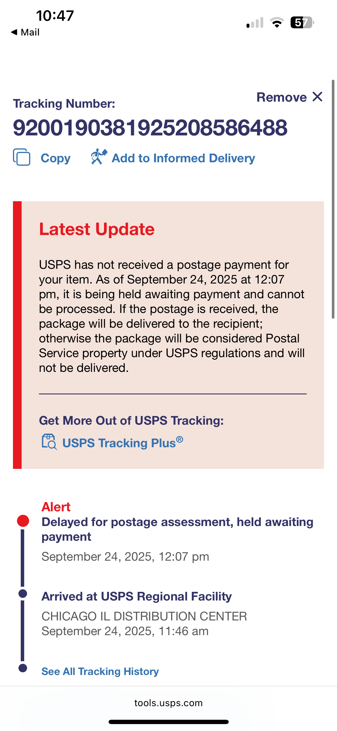 USPS has not received a postage payment for your item. As of September 24, 2025 at 12:07 pm, it is being held awaiting payment and cannot be processed. If the postage is received, the package will be delivered to the recipient; otherwise the package will be considered Postal Service property under USPS regulations and will not be delivered.