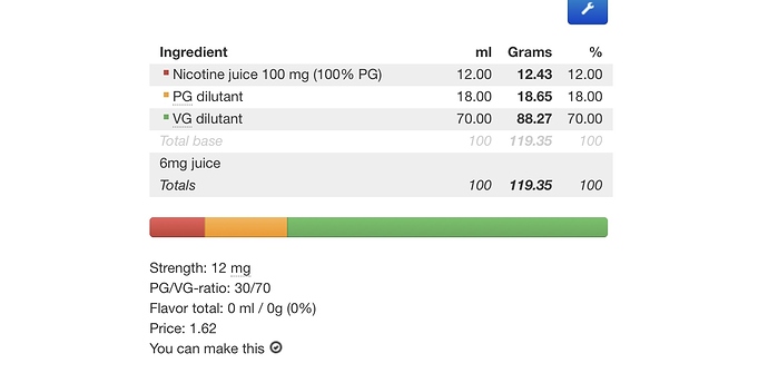thanks so much everyone. this really helps. although, i still can’t visualize it. aaarghh! like, i can visualize that if i add 1 mL of a 12 mg/mL nic solution to 1 mL of a 6mg/mL nic solution the 12 + 6 = 18 mg divided by 1 + 1 = 2 mL would come out to 18/2 = 9 mg/mL. but with the 100mg/mL, 6 and 12 and whatever, i just can’t. i lose it. LOL. but at least i have a number that i can work with. thanks! i’ll have to study the table and formulas until a light bulb turns on in my head