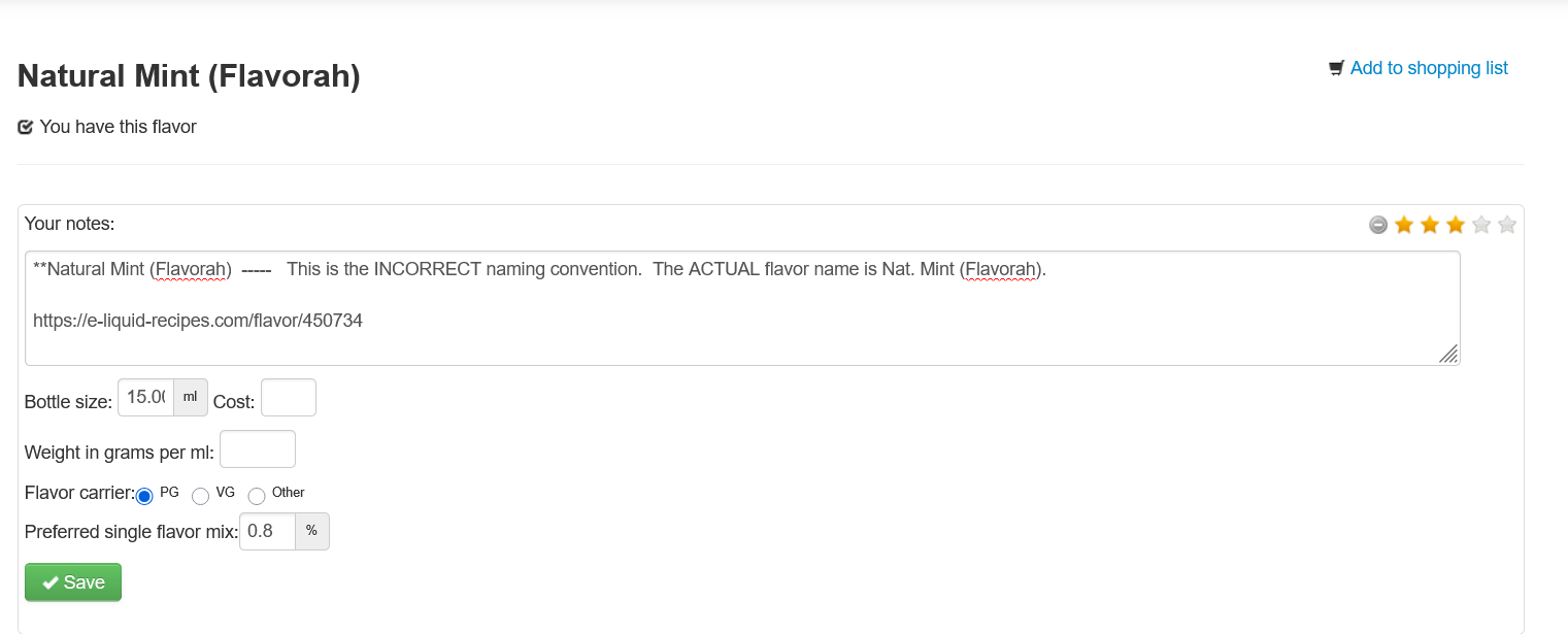 hey just a heads up so your notes go to the right place on the calculator side, the Nat. Mint (FLV) is not listed “Natural Mint” on the Flavorah website…