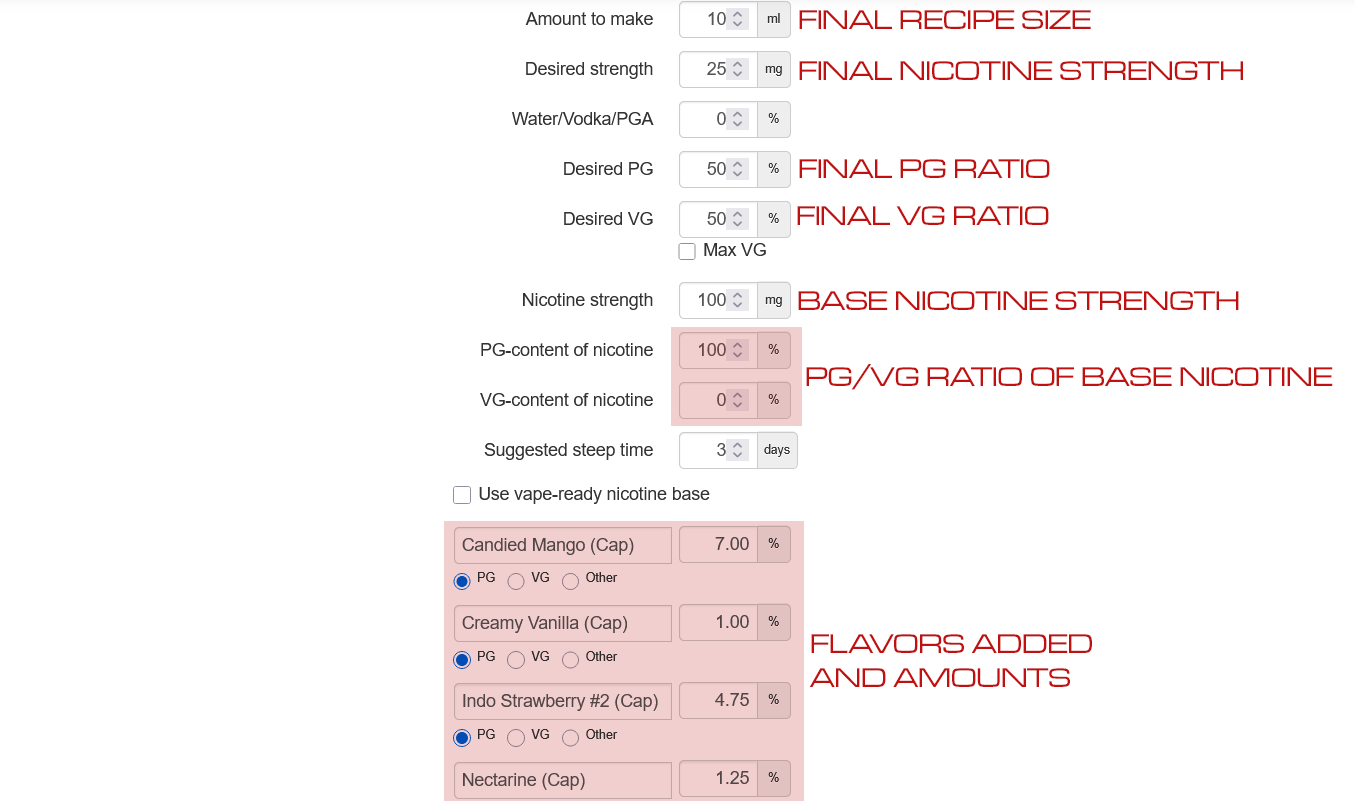 This may be the wrong place to ask but would someone be able to link me a random recipe using this 100mg/ml premix to achieve the desired 2.5% final product? I am having a hard time wrapping my head around the recipe creator/calculator.