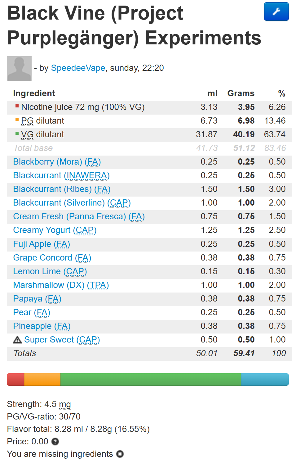 Considering moving on from this, finding it too hard! Can see these tries are going in the wrong direction and a bunch of taste testing I’ve been doing, I just can’t nail it down. Sometimes I think I’m close but…no! That’s not to say that my attempts are horrible, but they’re not black vine. Not even really sure that the original stuck to one vendor for flavours, feeling a little defeated and think I need to gain far more experience, might need to try altogether different recipes and find other ADV’s