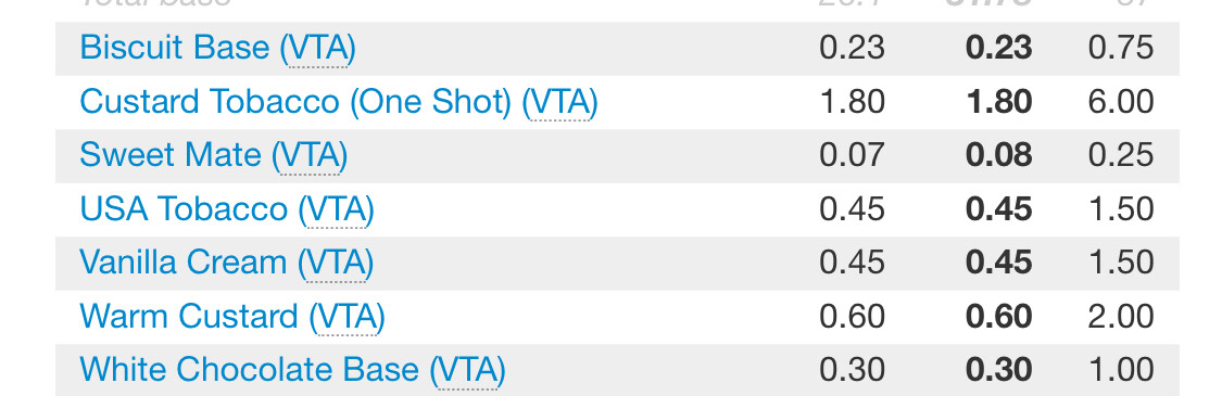 My unique all VTA based take on an RY4. Using VT Custard Tobacco as my RY4 base and adding some depth with VTA Crème Brulee for its vanilla and caramel custard notes. Then increasing the rich vanilla notes with VT Vanilla Classic and adding some darker caramel notes with VT Scorched Caramel and VT Raw Sugar for some brown sugar notes to enhance the caramel.