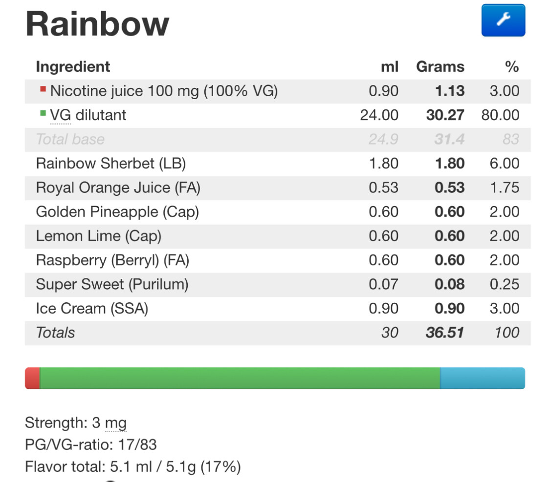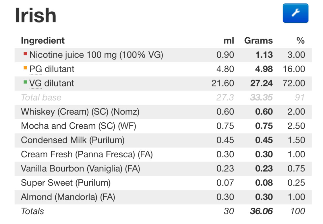 Truth be told I did nail this within my first 25 attempts but it was always that Scotch Whiskey that threw me off. It’s a sore thumb kind of flavor. As it stands out so much after the shake that it overpowered everything. There were a few factors that helped me to realize my mistake. First I found a 30 ml bottle of Rocky’s Magnum recipe that I mixed 2 years ago when he first released it. It has scotch whiskey @2%. And it was really quite smooth after a 2 year steep. Second while playing with Ai I asked it to create an Irish Cream using Vape Train flavors and it gave me almost my exact recipe! I had to go back through hundreds of recipe attempts to verify that I had tried that combo. Third was something Ken O Where said to me about a simple recipe I did called Key Lime Cookie. It was good after the shake but was quite sharp due to the Key lime, but after he mixed it and gave it a long steep it really softened into a delicious mix. Come to find out I had Irish Cream figured out I just never gave it time to mature properly.