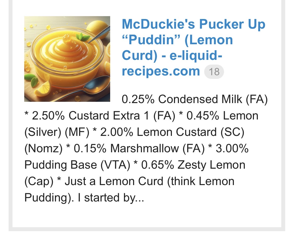 The only thing I changed was omit the FW Sweetener and boost the RY4 by a pct. Delicious off the lick, havenāt vaped yet.